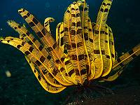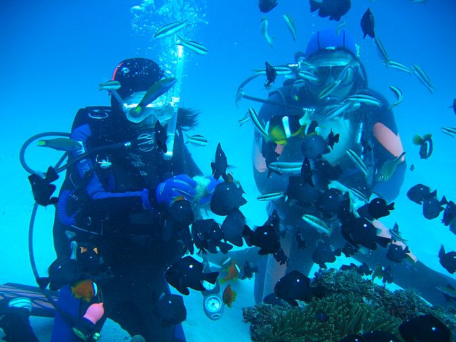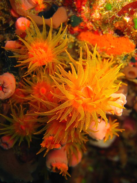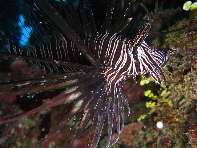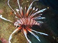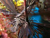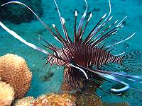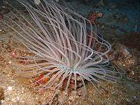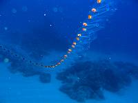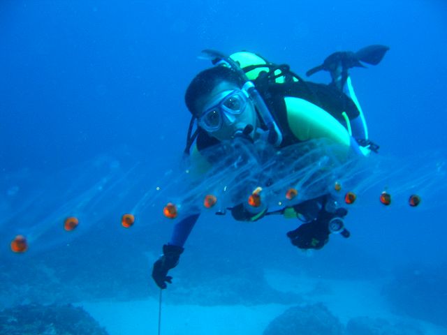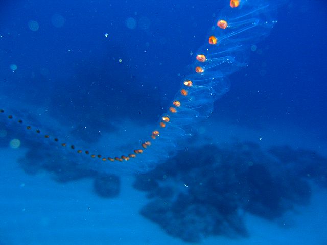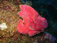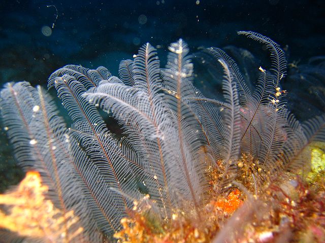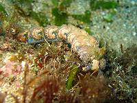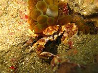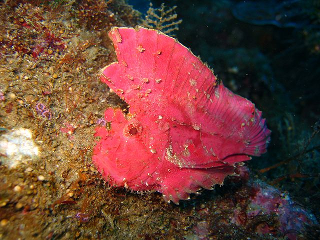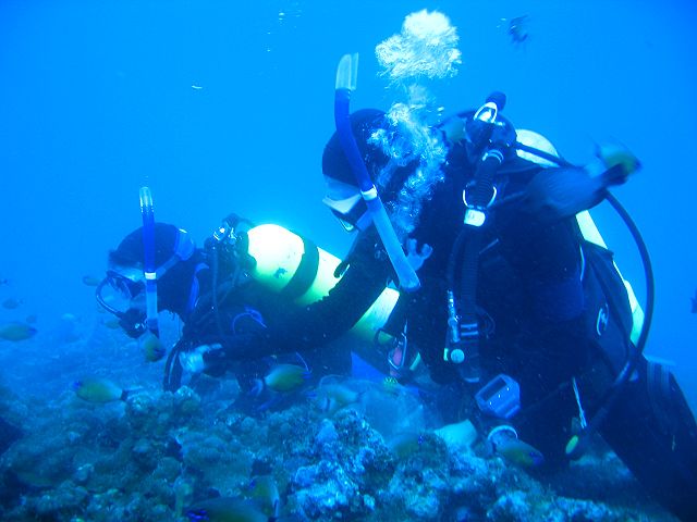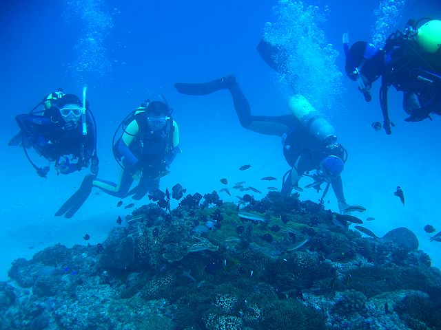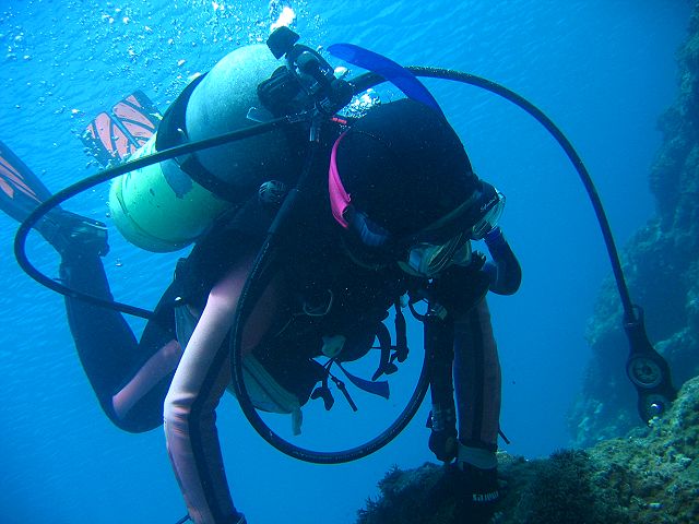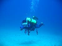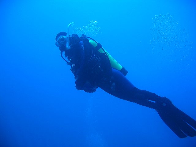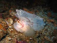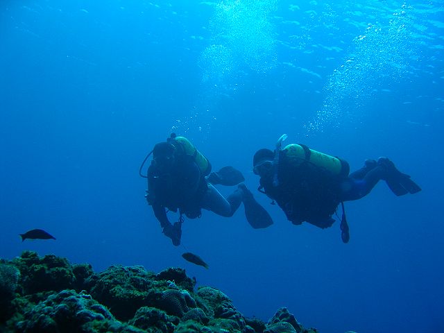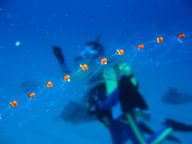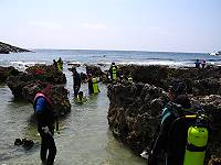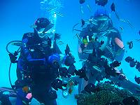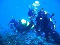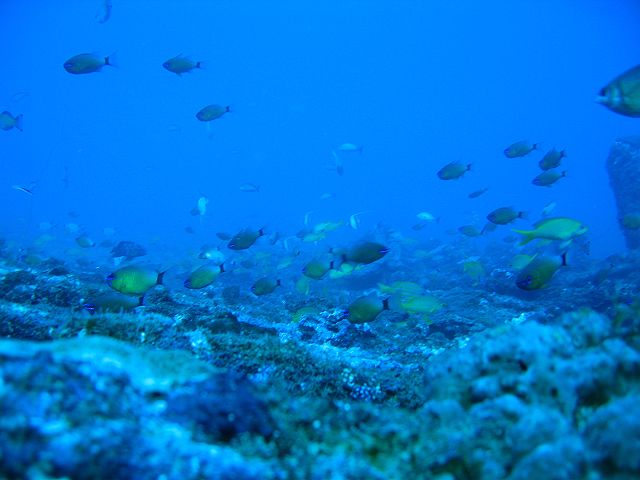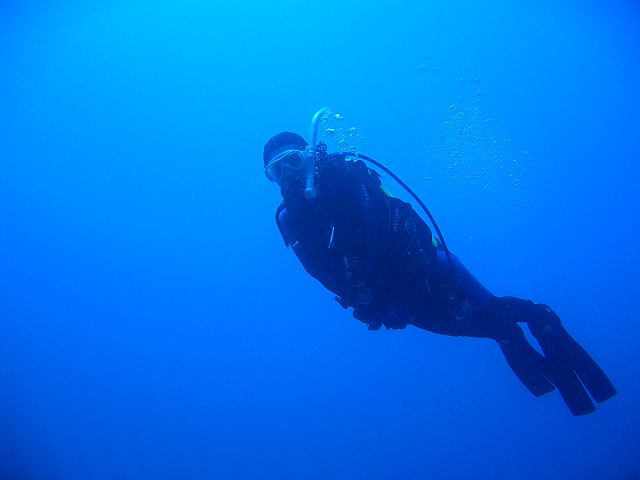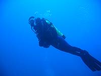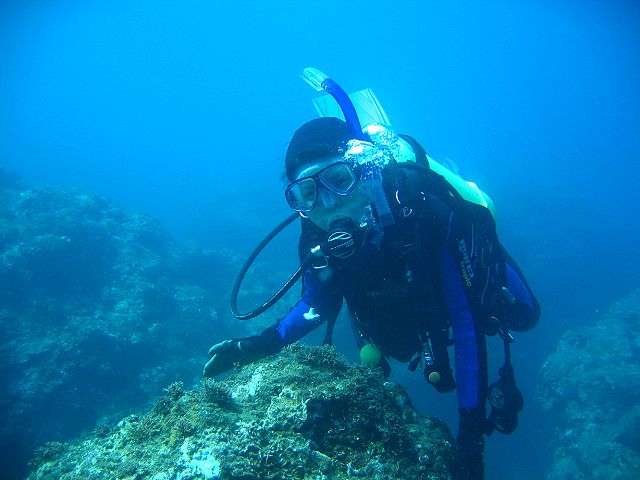 這一週參加活動的人數不多,也都是熟悉的夥伴,週六一早集合後,決定就先去合界的"排骨",一是帶大家去嚐鮮,二則自己也可以再把路線摸熟。下水,唉呀~~怎麼會這樣咧?水色比起昨天下午又更糟了,幾乎不到十米,莫非這個週末的運勢就是如此。順著昨日的路線進行,到了預定深度卻無發現,昨日下午是極緩流往南,今日是極緩流往北,所以再往南找找,幾分鐘後終於找到了,不過可以停留的時間所剩不多,趕緊將剛剛買來的秋刀魚拿出來攀攀交情。