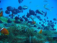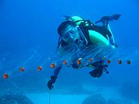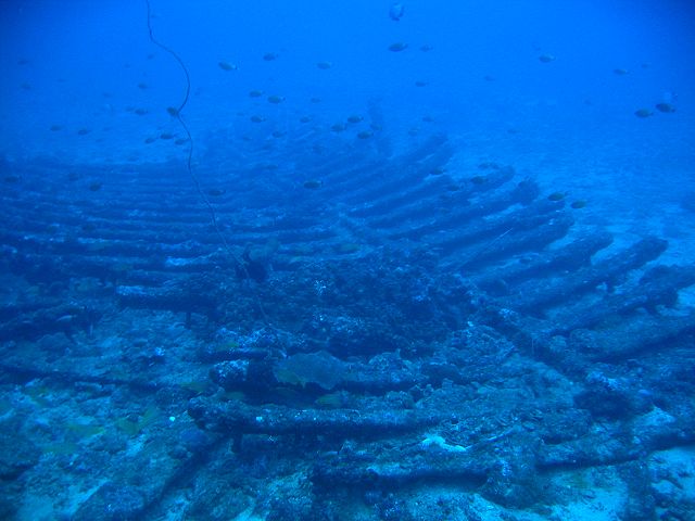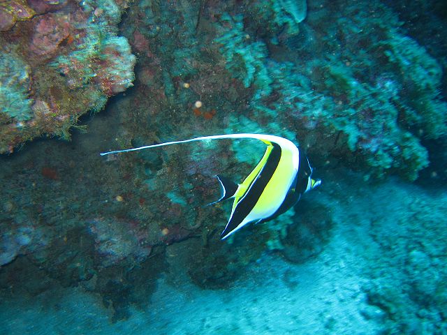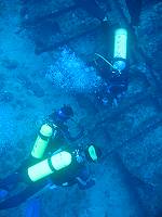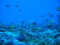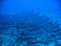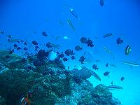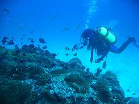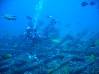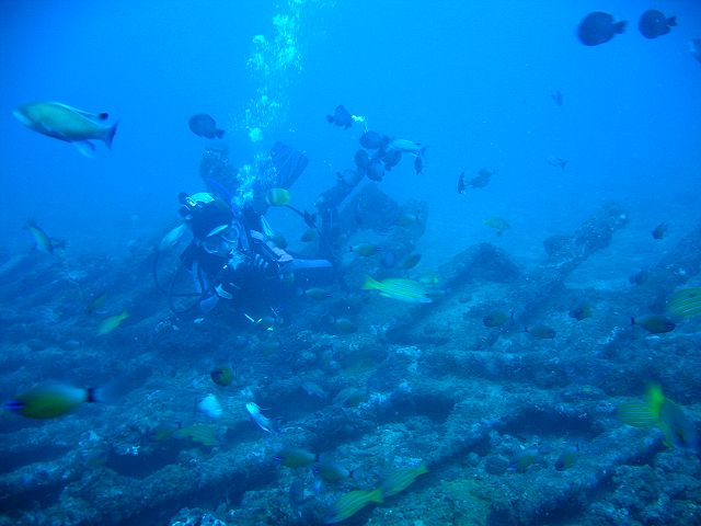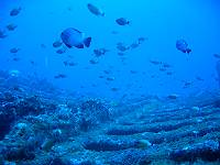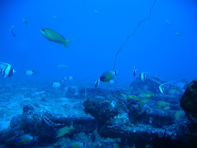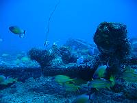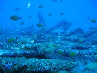 週五一樣先到墾丁去"試水溫",和另一位潛友會合之後原本計畫去頂白沙,在車上交談時聊到合界的"排骨";早就聽說過這僅剩船肋殘骸的沉船,不過一直沒找到,潛友說知道在哪兒,於是改變計畫請她帶我去認識一下。下水後,能見度僅十餘米,不如預期的好;依計劃路線進行,過了斜坡游進平坦的大緩坡,再踢了幾分鐘,那"排骨"就順利的出現了。這"排骨"在這平坦的大緩坡裡就像是沙漠中的綠洲,將不少魚兒聚集了過來,五線笛鯛、天竺鯛、金花爐、關刀、松毬魚........好不熱鬧,也發現了兩尾較少見的葉魚。