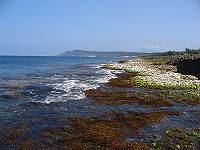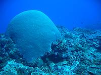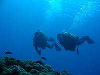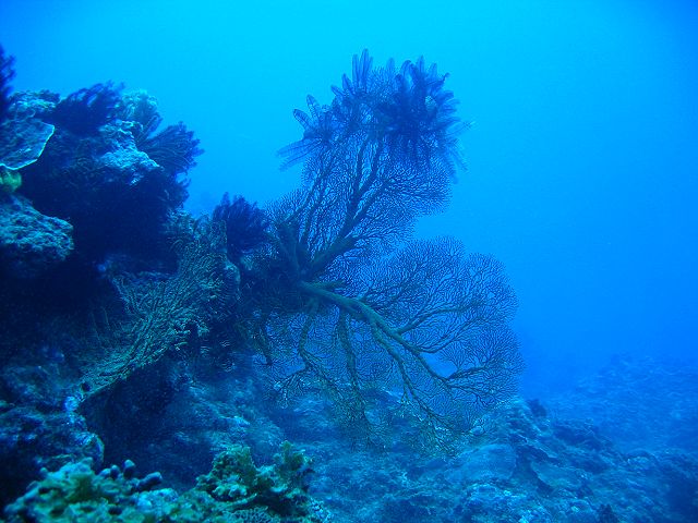 因為能見度不怎麼樣,因此決定換到出水口看看,或許灣內的情況會比西岸來得好;下水後踢出小斷層,呵~~還真的比較好,快十五米呢。一路過湯盤礁往笛鯛礁踢去,路線是正確的,然而就在抵達笛鯛礁前,居然開始懷疑自己是不是偏向了,先往東轉,不太對,再往南轉,到了二十二米,嗯~~有點印象的礁石和地形,幕然驚覺,唉呀~~竟是繞到笛鯛礁的尾端了,多踢了好一段冤枉路。