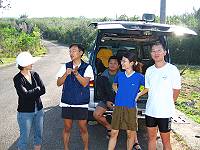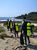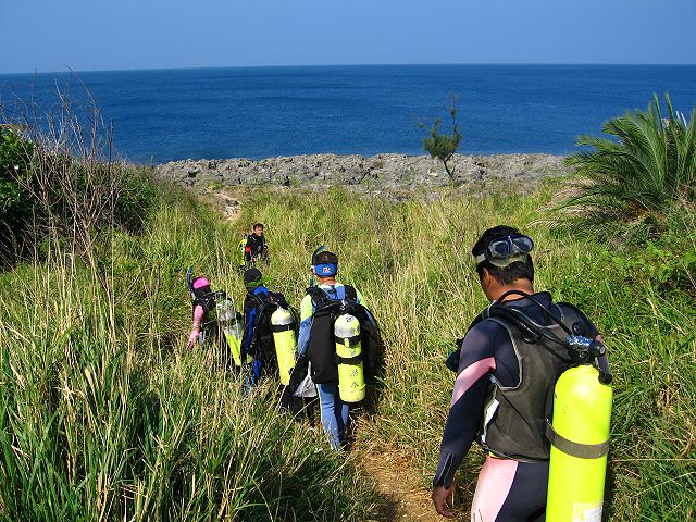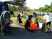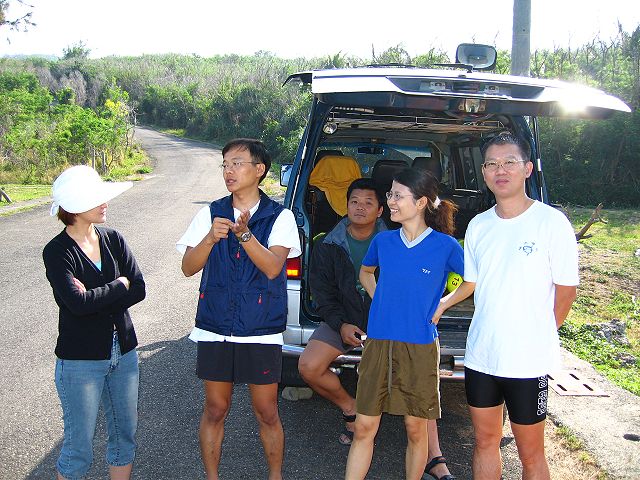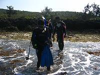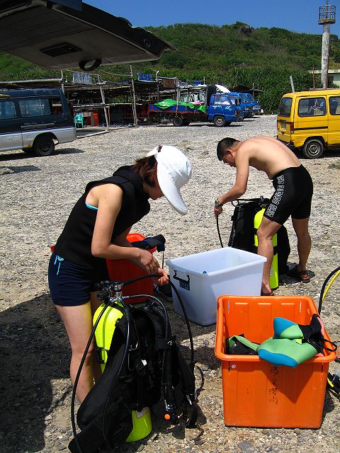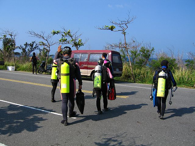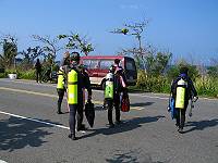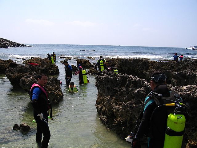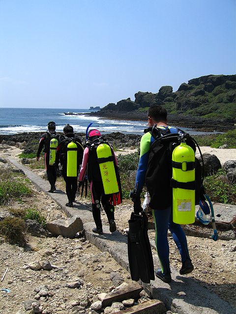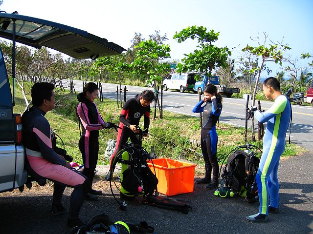 出水前,瞧見一群潛水人剛下水,個個一把長槍,唉~~!上岸後,有兩位打算背雙瓶和高氧氣瓶的潛水人帶了長槍,也要到"排骨"去,這下子........不免要擔心那兩尾薯鰻的安危了;我們帶秋刀魚去攀交情會不會反而是害了牠們呢!