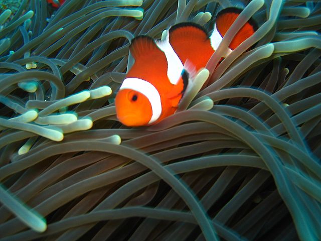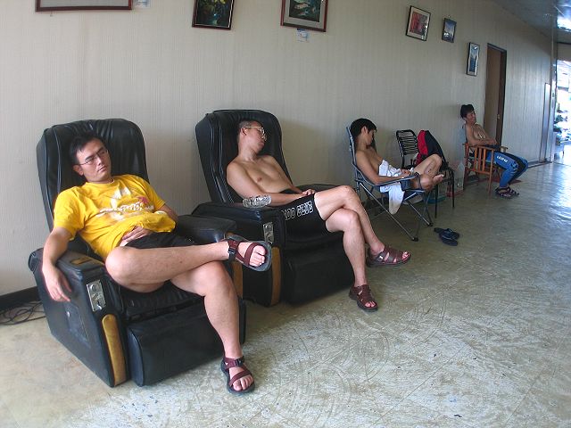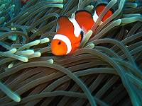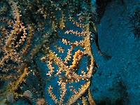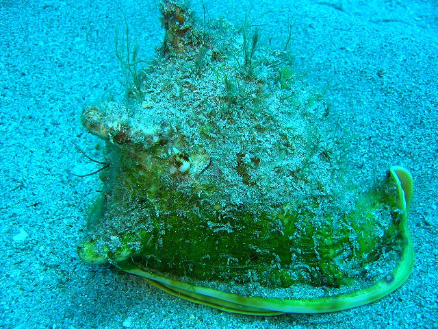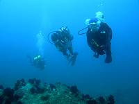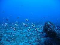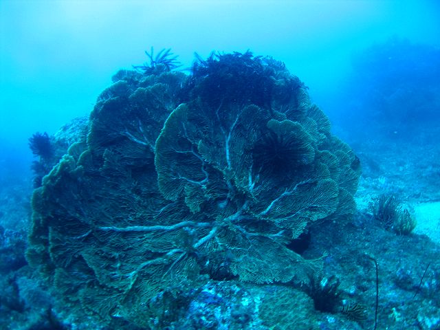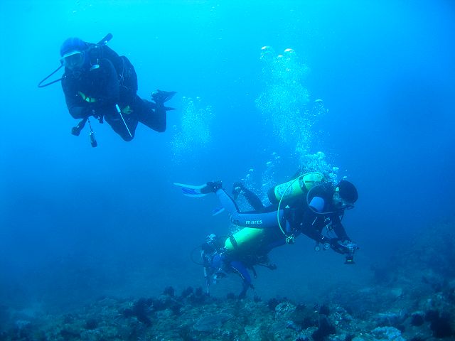 下午到合界,嗯~~氣象預報說是偏南風,怎麼是迎面吹來的西北風咧?和汪大哥先走到水邊瞧瞧,入水點的浪是有點兒大,不過應該還不至於不能應付;人數不多,藉此訓練一下、增加點經驗也是好的。下水後循上週日最後一支氣瓶調整的路線前進,沙地走廊中段那朵千手海葵後面的洞裏這回躲了隻大斑裸胸鯙,趕著先下深,盤算好等會兒再來攀交情。從礁盤邊往緩坡切入直向排骨踢去,不過能見度比上禮拜差多了,實在不是很有信心能一次中的,兩分鐘過後,呵~~排骨現身了。拿出秋刀魚,裸胸鯙弟弟在家,不過沒看見裸胸鯙哥哥,有趣的是洞裡同時躲了一隻螃蟹,這螃蟹和裸胸鯙弟弟擠來擠去搶秋刀魚的樣子挺有趣的;金花爐、五線笛鯛、關刀、松毬........依然熱鬧。是第三支氣瓶了,不能多待,五分鐘後離開排骨,切著往南的流踢回沙地走廊,然後把剛剛留下的秋刀魚帶給千手海葵後面的大斑裸胸鯙。