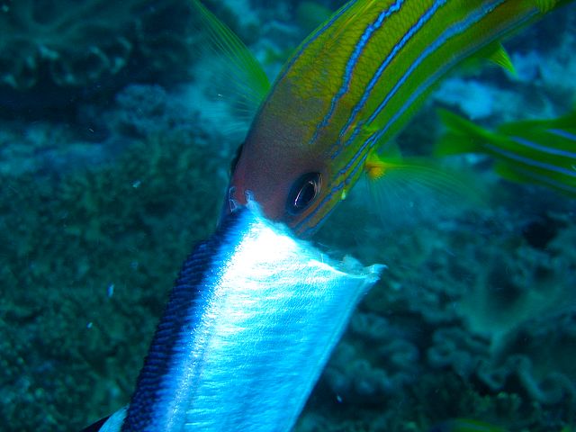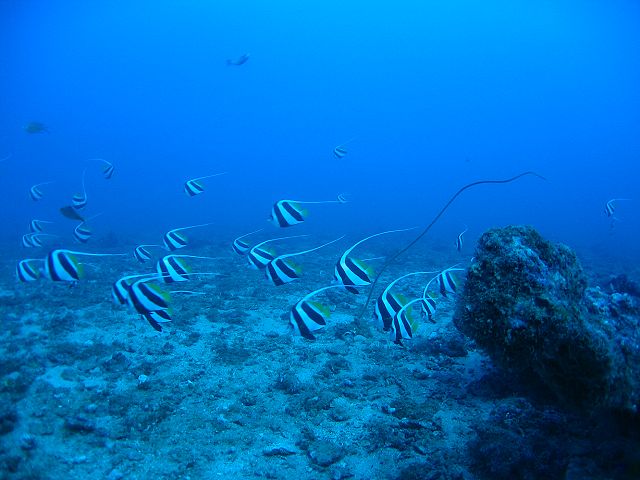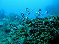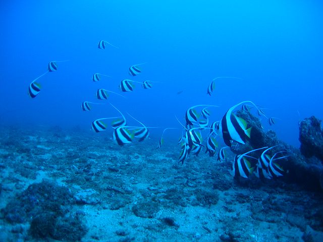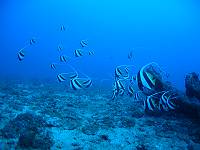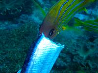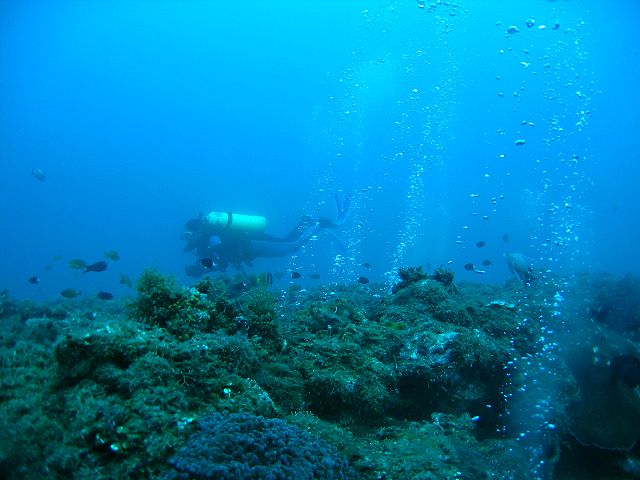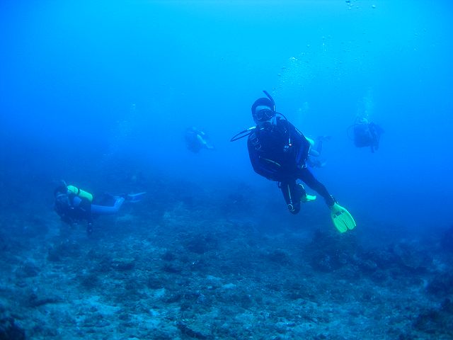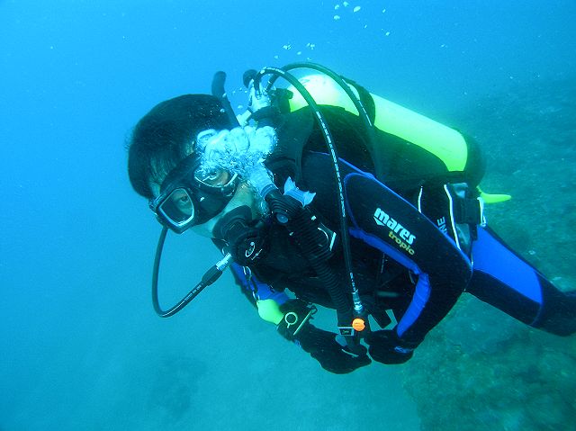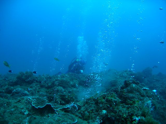週六上午兩支出水口,唉~~水色是比昨天的萬里桐好些,不過也好不了多少。第一支氣瓶下水,怪了,今天的出水口怎麼這麼冷清?沒什麼魚耶?沿途遇見的潛水人都快比魚多了;等到第二支氣瓶下水時,才見到比較多的魚。是潮水的影響嗎?剛剛魚兒都躲到哪裡去了?第二支氣瓶去笛鯛礁,有了上週的經驗,這一次很堅定方向和路線,可是,怪了,居然又是踢到了笛鯛礁的尾端。笛鯛礁的五線笛鯛現在大概已經開始熟悉這些吐泡泡、游得很慢的怪物了,會主動跟過來;我們當然也不能讓牠們失望,伴手的秋刀魚可沒忘記帶上。又見到了大海龜,牠還在,真好!