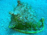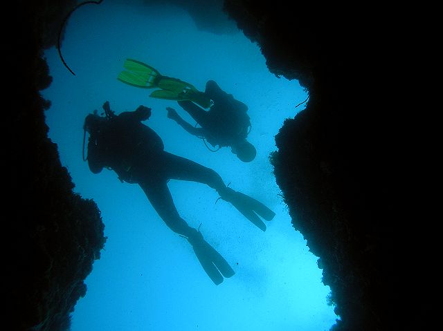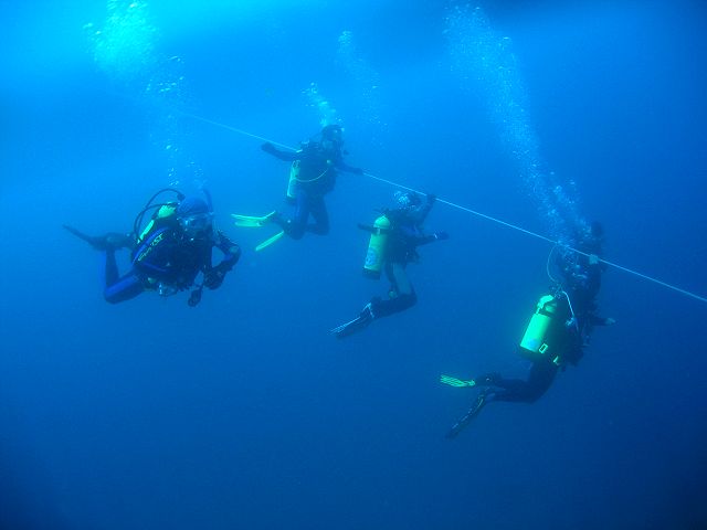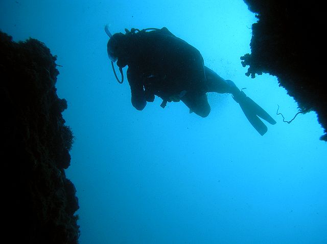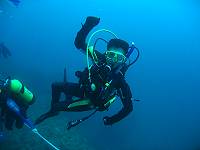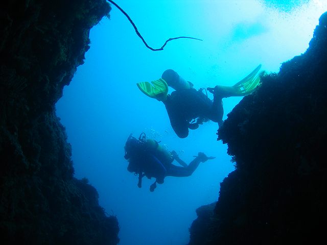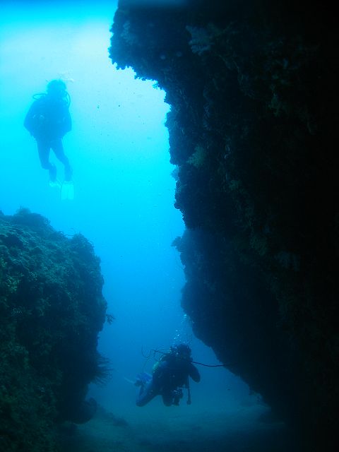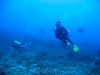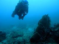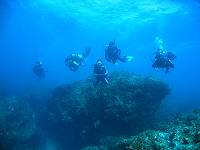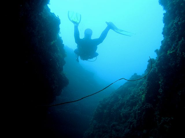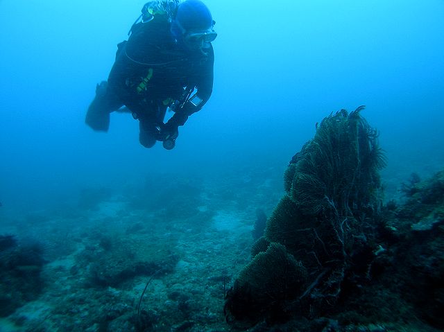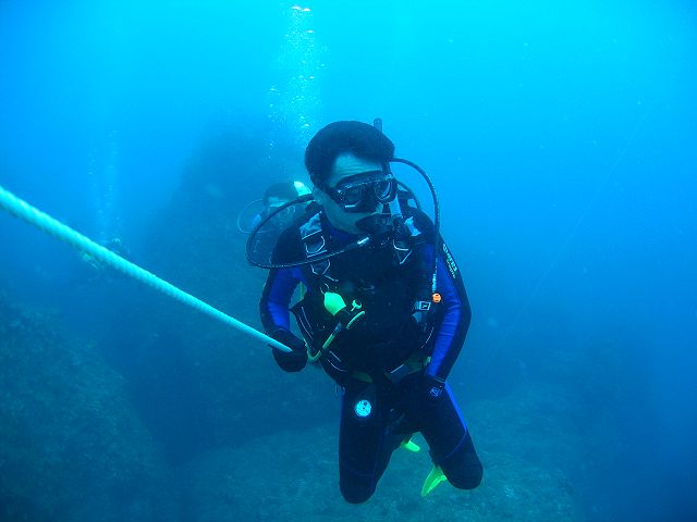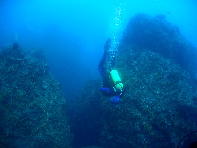 頂白沙的水色比昨天的合界又差了些,還好船長潛點放得滿準的,入水落底就在海扇區北邊一點兒,認得,稍微頂點兒流往海扇區逛去,再順著流往北慢慢的飄;船潛就是這時候輕鬆啦!第二支氣瓶下久違的赤筆仔礁;自從水底的導引繩消失了之後,只有去年底和汪大哥從廟前岸潛來探索搜尋了一次,雖然幸運的找到了,不過距離太遠,只能匆匆地繞了一圈。今天是下了錨,順錨繩直達礁石,時間多到可以繞了兩圈再穿來鑽去,嘆氣的是水色比頂白沙又更差了,掃了興緻。